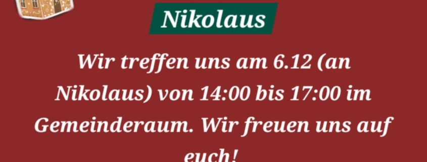 Wir treffen uns am 6.12 (an Nikolaus) von 14:00 bis 17:00 im Gemeinderaum. Wir freuen uns auf euch!